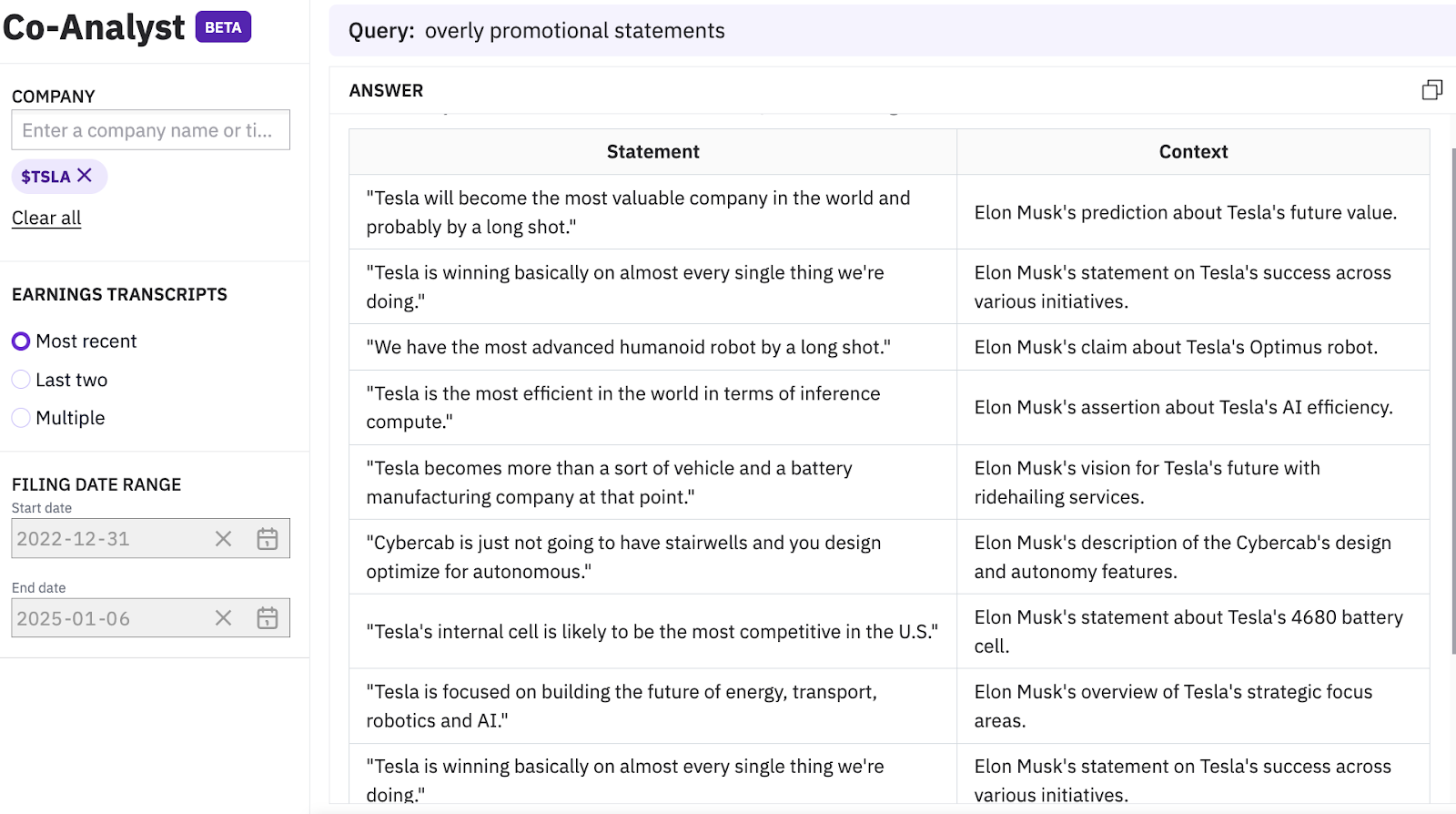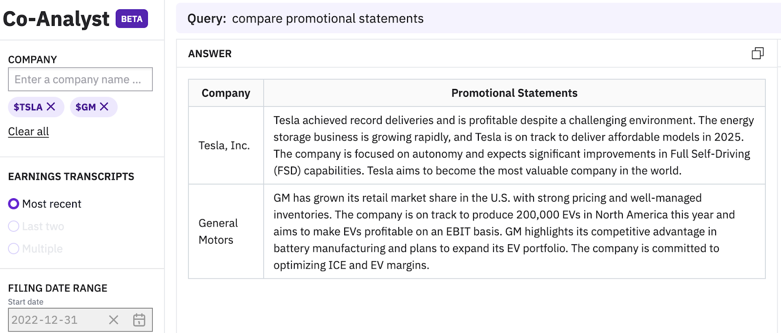 Understand whether promotional statements are comparable to the tone and claims of peers. The Co-Analyst compared Tesla $TSLA to General Motors $GM below.