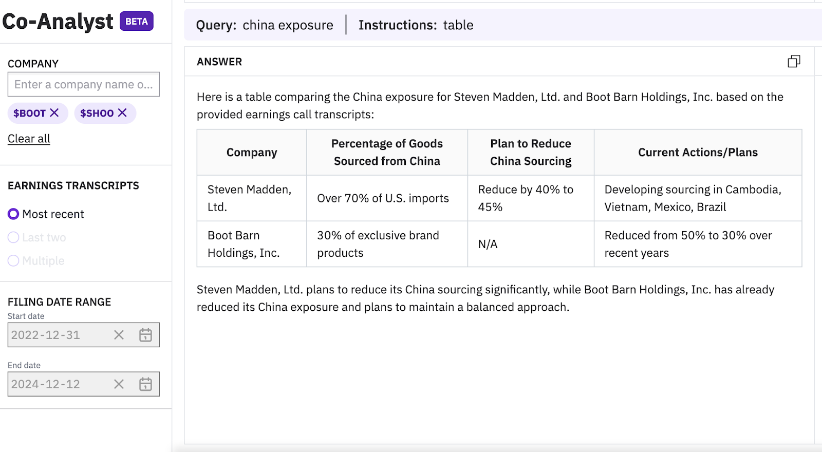 Dig into exposure to key risk factors across multiple companies. The Co-Analyst found significant exposure to China at Steven Madden $SHOO and Boot Barn Holdings $BOOT.