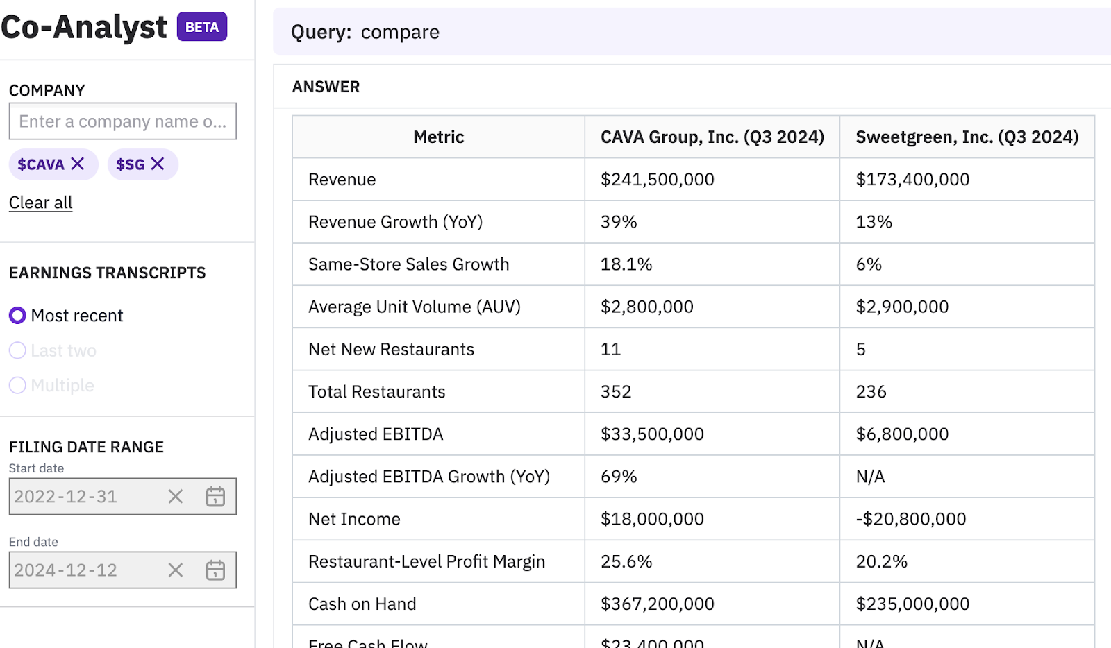 Compare discussion of core KPIs between CAVA Group $CAVA and Sweetgreen $SG.