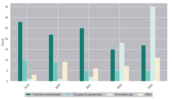 These types of proposals have been falling in 2022 and 2023, while compensation-related proposals around termination pay have been on the rise.