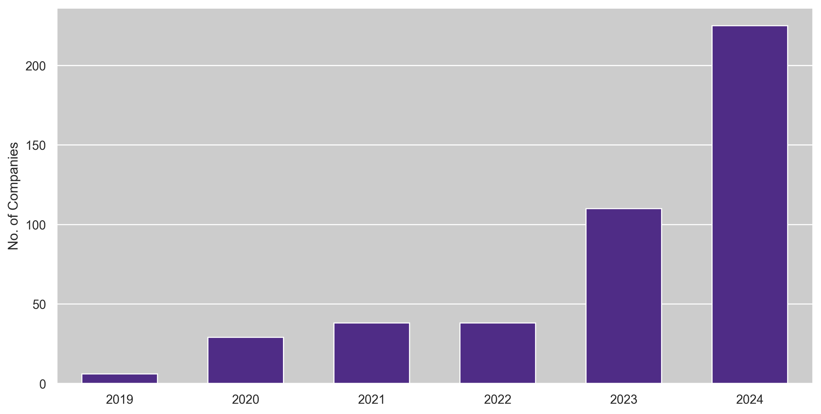 The trend in analyst questions has also accelerated in the first two months of 2024. **We found that 225 companies were asked questions regarding artificial intelligence during their earnings calls in the first two months of 2024, compared to 110 companies in the same period last year and only 38 companies in 2022.