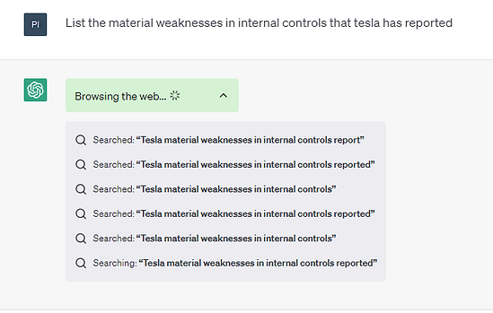 Some claim that if generative LLMs have access to the web in real-time, they can get more factual and real-time results. However, the ChatGPT plugin we tried got stuck in a loop when we asked about internal control issues at Tesla. (Note, as of the date of publishing Tesla had reported none.)