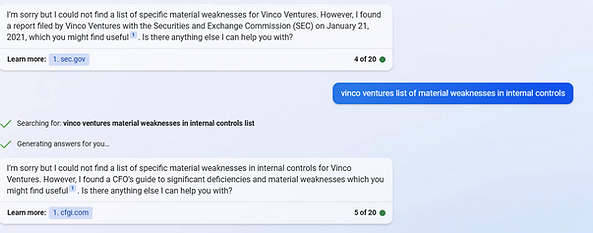 We asked Bing Chat about internal control issues at Vinco Ventures, a company that has had many. It first provided a link to a completely random SEC filing and then refused to answer.