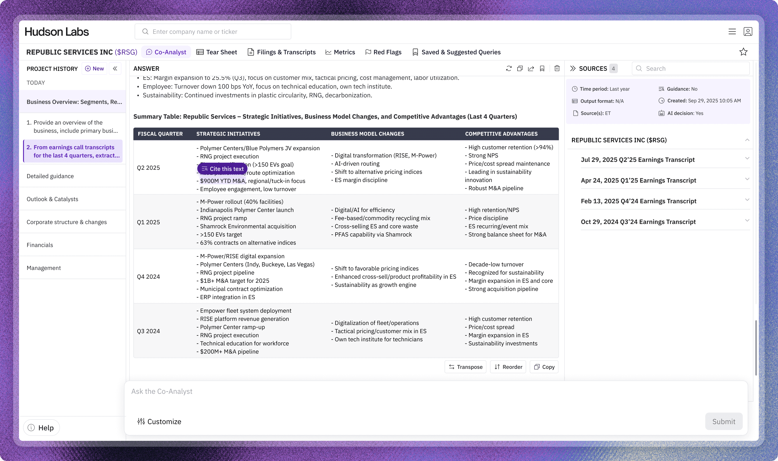 The Co-Analyst covers all U.S. issuers and ADRs, accessing SEC filings, conference/earnings call transcripts, investor decks, press releases and more.