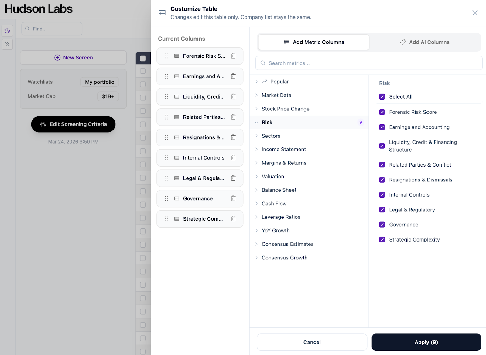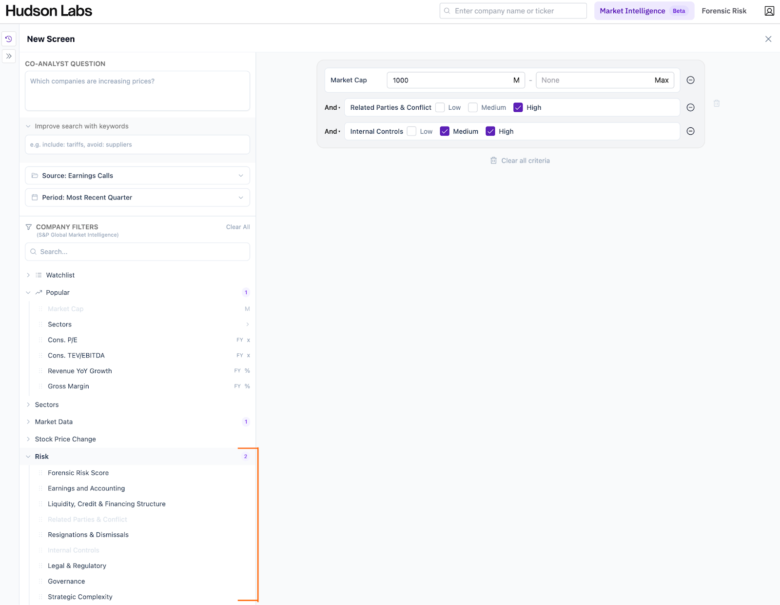 With the new Market Intelligence feature, you can create screens using the filters you care about — market data, financial metrics, and Hudson Labs forensic risk scores.