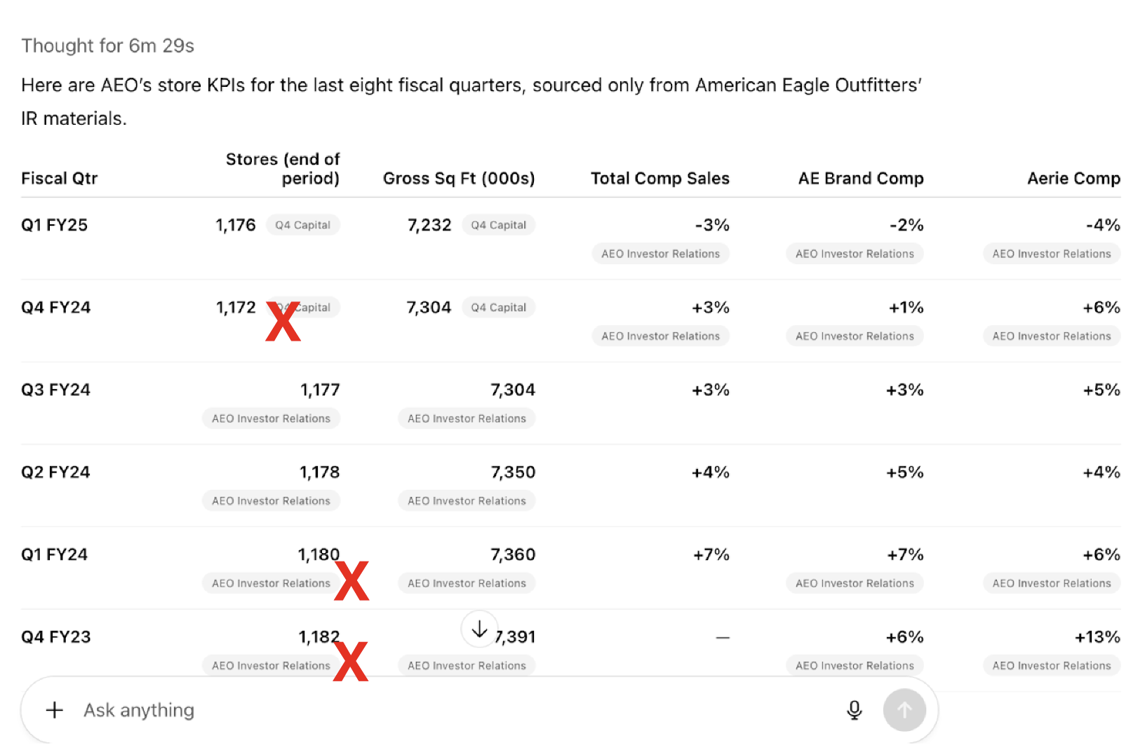 Below is an example where we asked GPT-5 to retrieve all store-related metrics for American Eagle (i.e. the reported results for the total of physical American Eagle stores and stores opened or closed etc.). Investors look at retail store growth and decline when assessing operational performance but this operating metric is not reported on the financial statements and therefore less standardized.